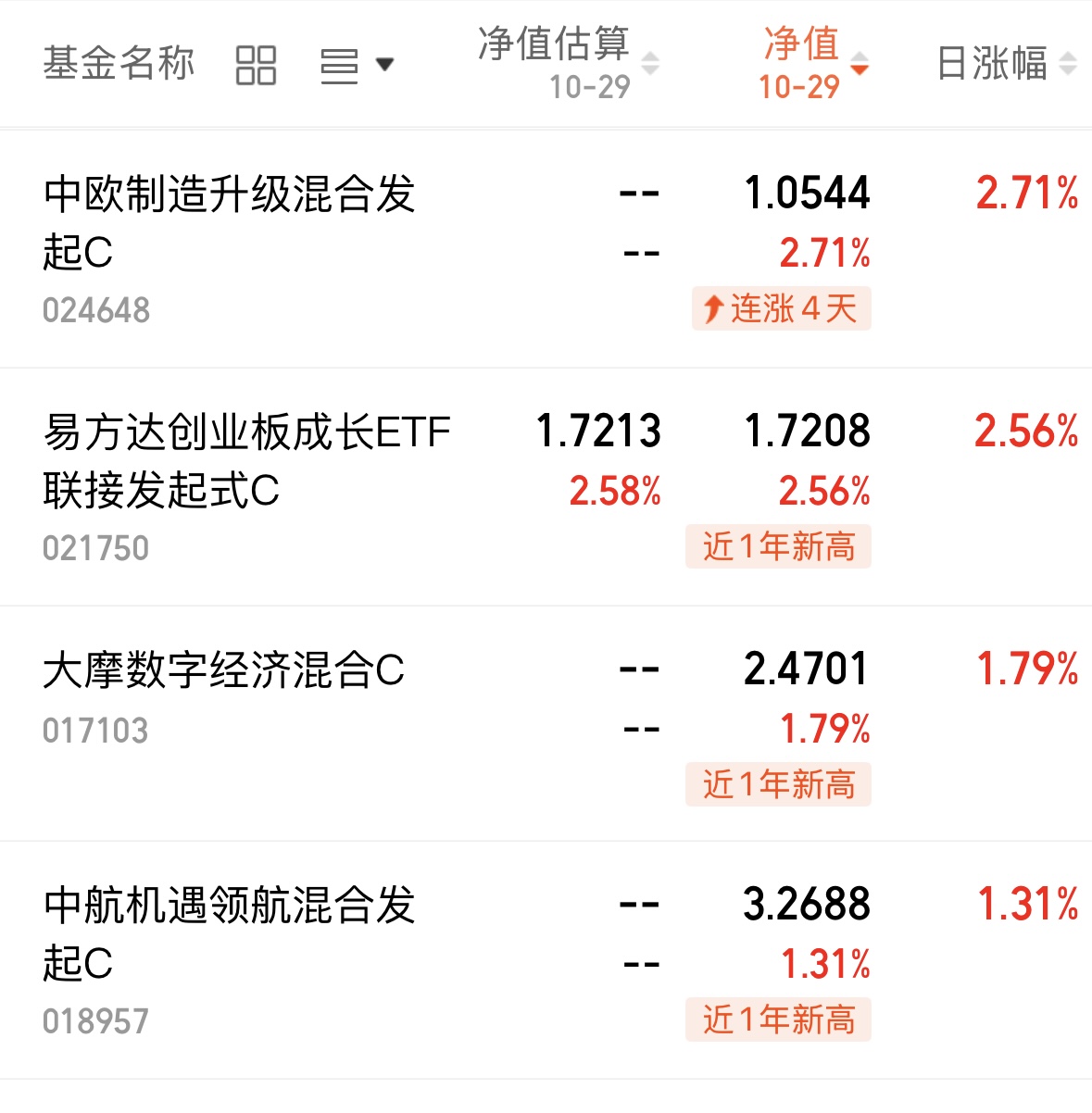 $易方达创业板成长ETF联接发起式C(OTCFUND|021750)$涨2.56%,$大摩数字经济混合C(OTCFUND|017103)$涨1.79%,$中航机遇领航混合发起C(OTCFUND|018957)$涨1.31%