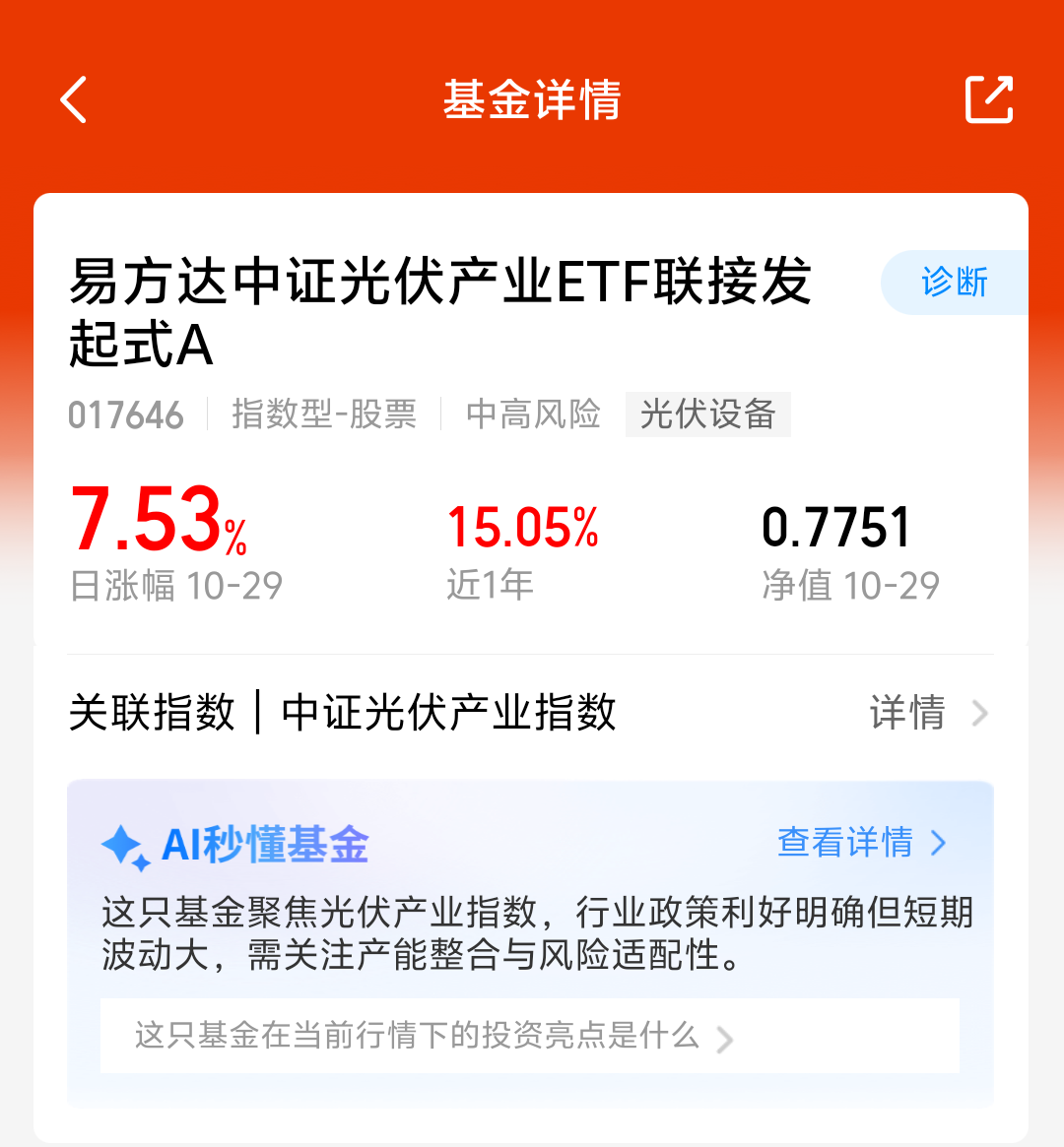 光伏板块今天赢麻了!大盘今天涨起来了,大科技、新能源等板块表现都不错,指数突破4000点,光伏暴涨,储能概念火爆,多晶硅收储平台有望于近期有积极进展,组件价格传导也有望逐步推进,$易方达中证光伏产业ETF联接发起式A(OTCFUND|017646)$今天大涨7.53%,近一周涨了10.57%,近三个月涨了32.41%,长期看好这个方向,我准备分批加仓了!