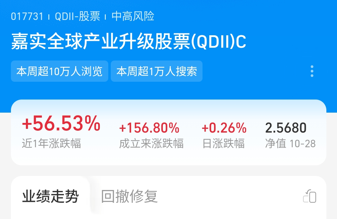 $嘉实全球产业升级股票发起式(QDII)C$ 近一年稳稳涨了56.53%,成长力肉眼可见,昨天又涨了0.26%,在利好风口下还能保持稳进节奏。不管是跟着大趋势还是看自身表现,都优秀。
