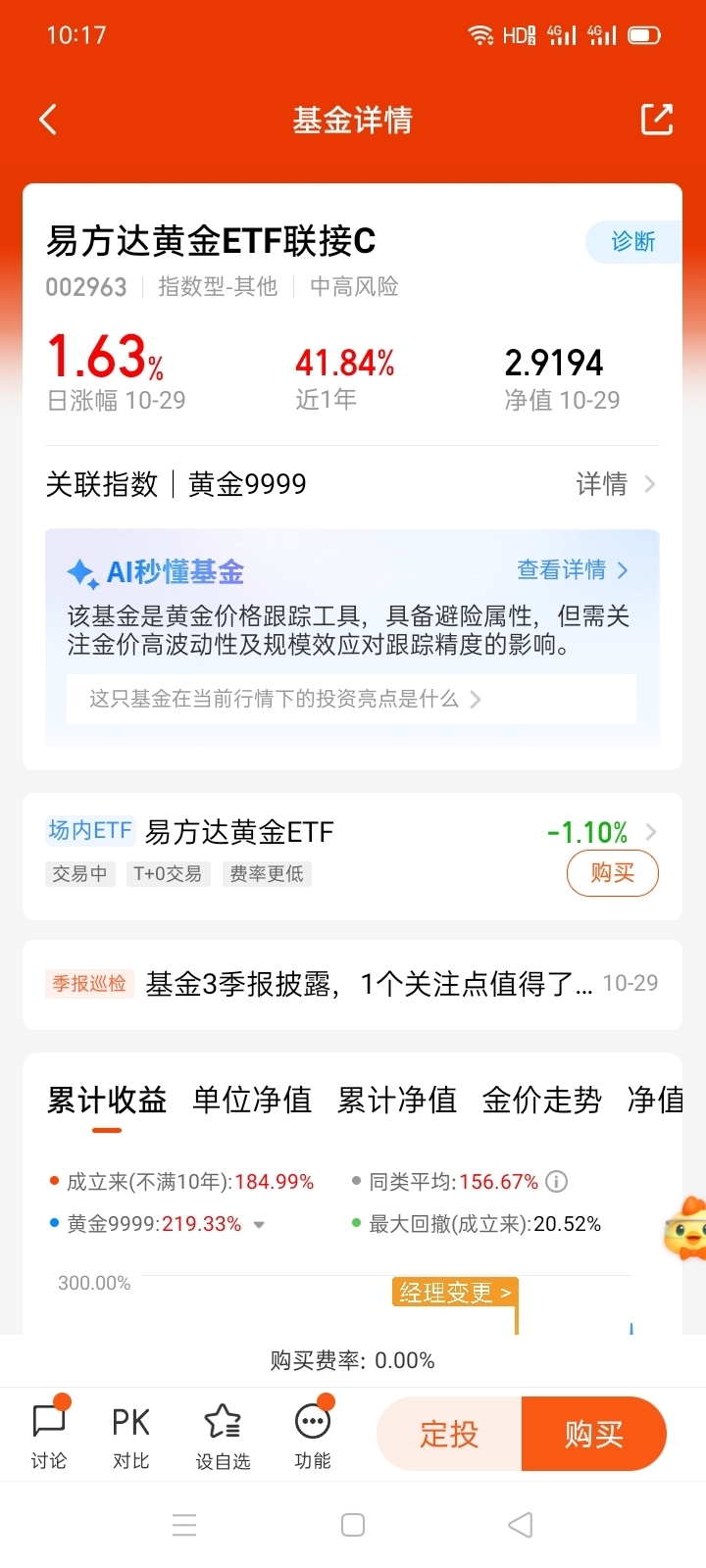易方达黄金 ETF 联接 C 主要投资于易方达黄金 ETF,而该 ETF 紧密跟踪上海黄金交易所的黄金现货合约价格。这意味着投资者可以通过投资该基金,间接获得与黄金价格相近的收益。同时,易方达基金作为国内知名的基金管理公司,拥有专业的投研团队和丰富的投资管理经验。基金经理会根据市场情况及时调整投资组合,确保基金能够紧密跟踪黄金价格走势,为投资者提供稳定的投资回报。