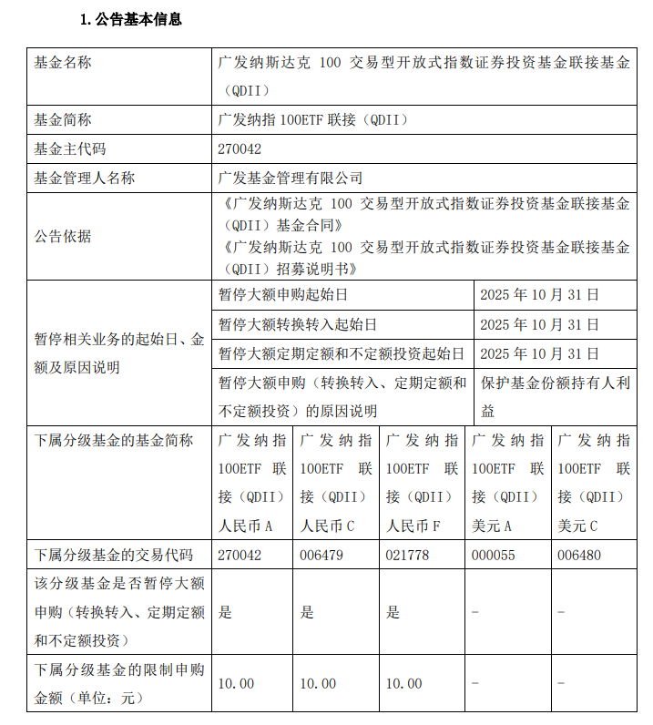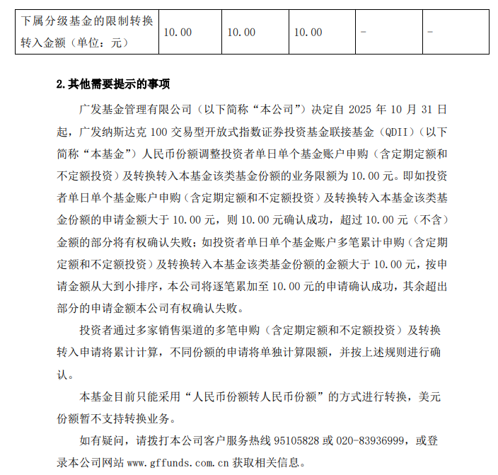 关于广发纳指100AC人民币份额申购业务限额的公告