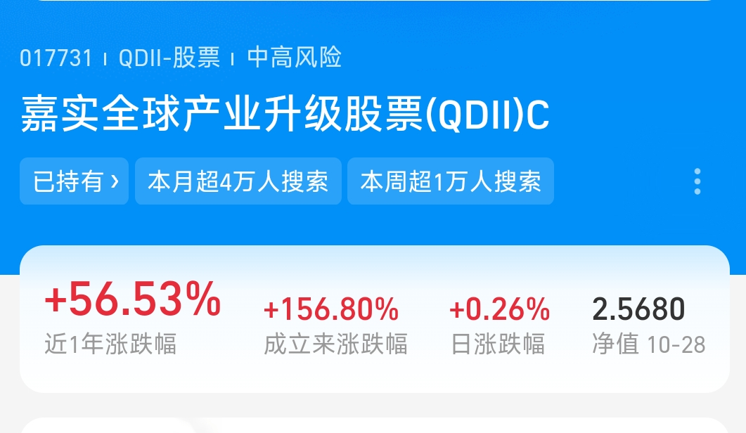 $嘉实全球产业升级股票发起式(QDII)C$ 持仓来看今天这个还是收涨较大,占比美股这边较多,还有部分的a股,当前英伟达的销量较多,这两天市指5万亿美元,全球首家市指最大公司,我还是继续期待美股上涨吧,这个近一年上涨了56.53%,业绩超乎一些纳斯达克100指数呢!