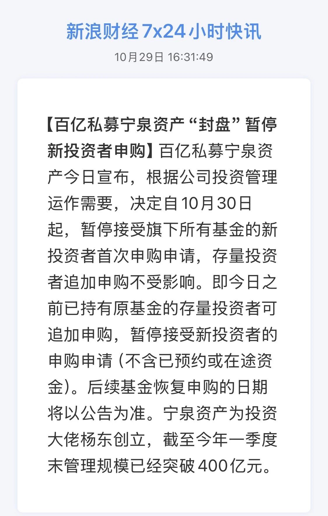 宁泉发公告封盘,只有存量客户能加仓,新客户不要了。