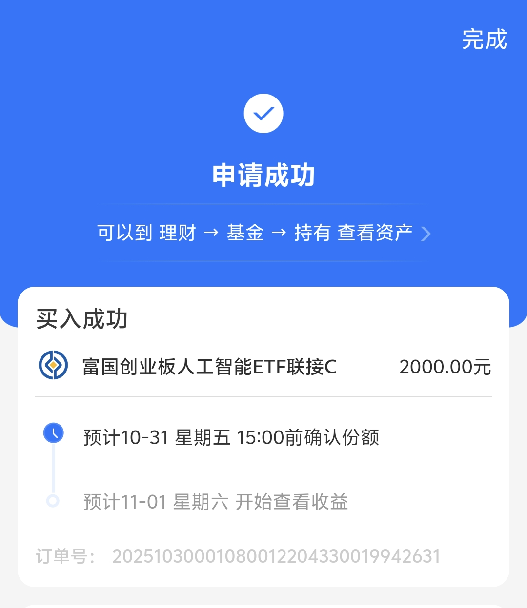 今天趁着市场调整,我又加了两千块到$富国创业板人工智能ETF发起式联接C$里。身