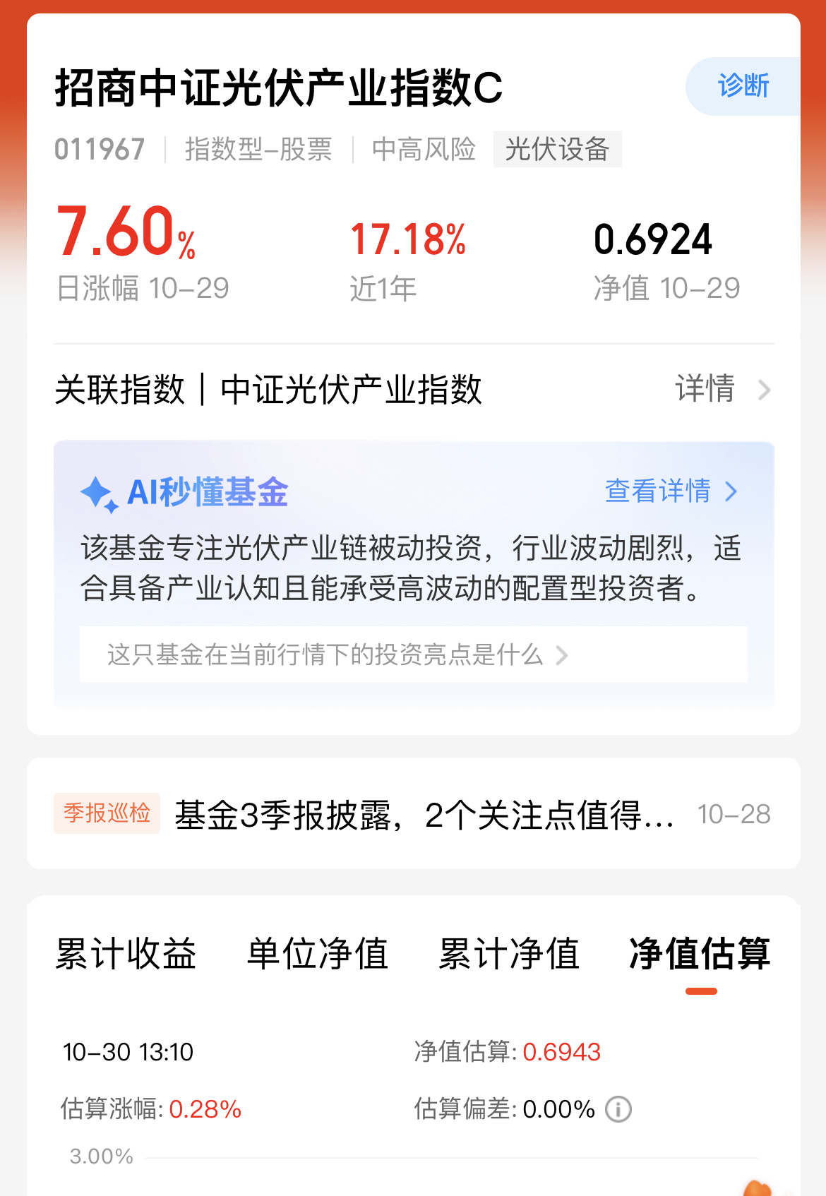 今天A股有点震荡,医药、军工都回调了,不过光伏赛道倒是挺给力的。$招商中证光伏产业指数C(OTCFUND|011967)$覆盖了光伏全产业链,近三个月涨了33.44%,近半年更是涨了54.97%,表现真不错。