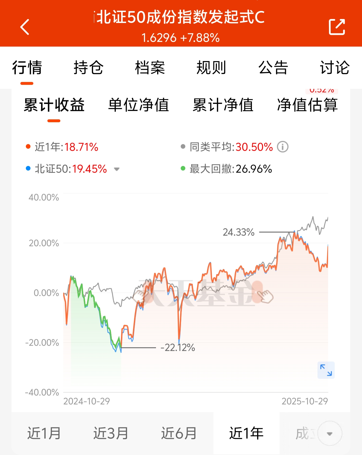 昨日真是太给力了,北证50指数大涨8.41%,迎来了久违史诗级别暴涨!$招商北证50成份指数发起式C$ 招商北证50昨日大涨7.88%,近一年涨幅18.71%,表现非常优秀。其持仓主要以创新型中小企业为主,行业分布聚焦硬科技领域,覆盖半导体、生物医药等细分赛道,核心技术突破助力业绩增长,长期成长动能充足。流星还是比较看好其后市的,行情向好,可以逢低布局
