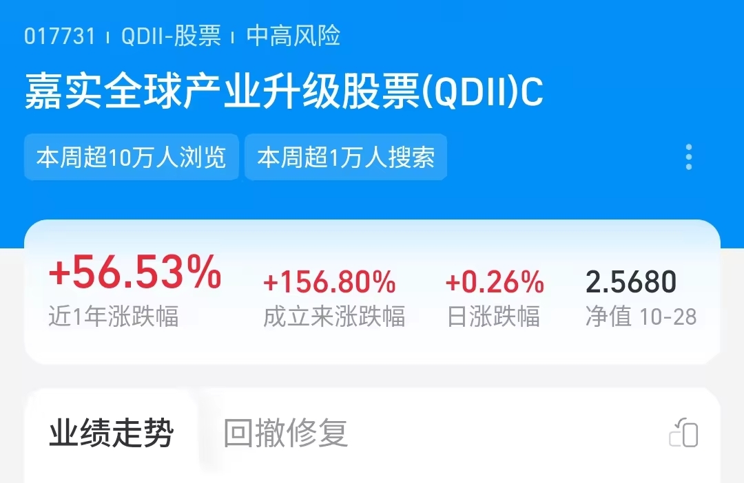 近期市场的一系列好消息,成功带动了市场信心。国际局势趋于缓和,美联储降息的预期持续升温,受此影响,全球科技板块一路发力,展现出不俗的表现。嘉实全球产业升级股票(QDI)CS更是交出了亮眼答卷,近一年稳稳上涨56.53%,成长力肉眼可见。即便身处利好风口,它也没有急于求成,昨天再涨0.26%,稳扎稳打的节奏让人安心,无论是贴合大趋势还是自身硬实力,都十分出众。