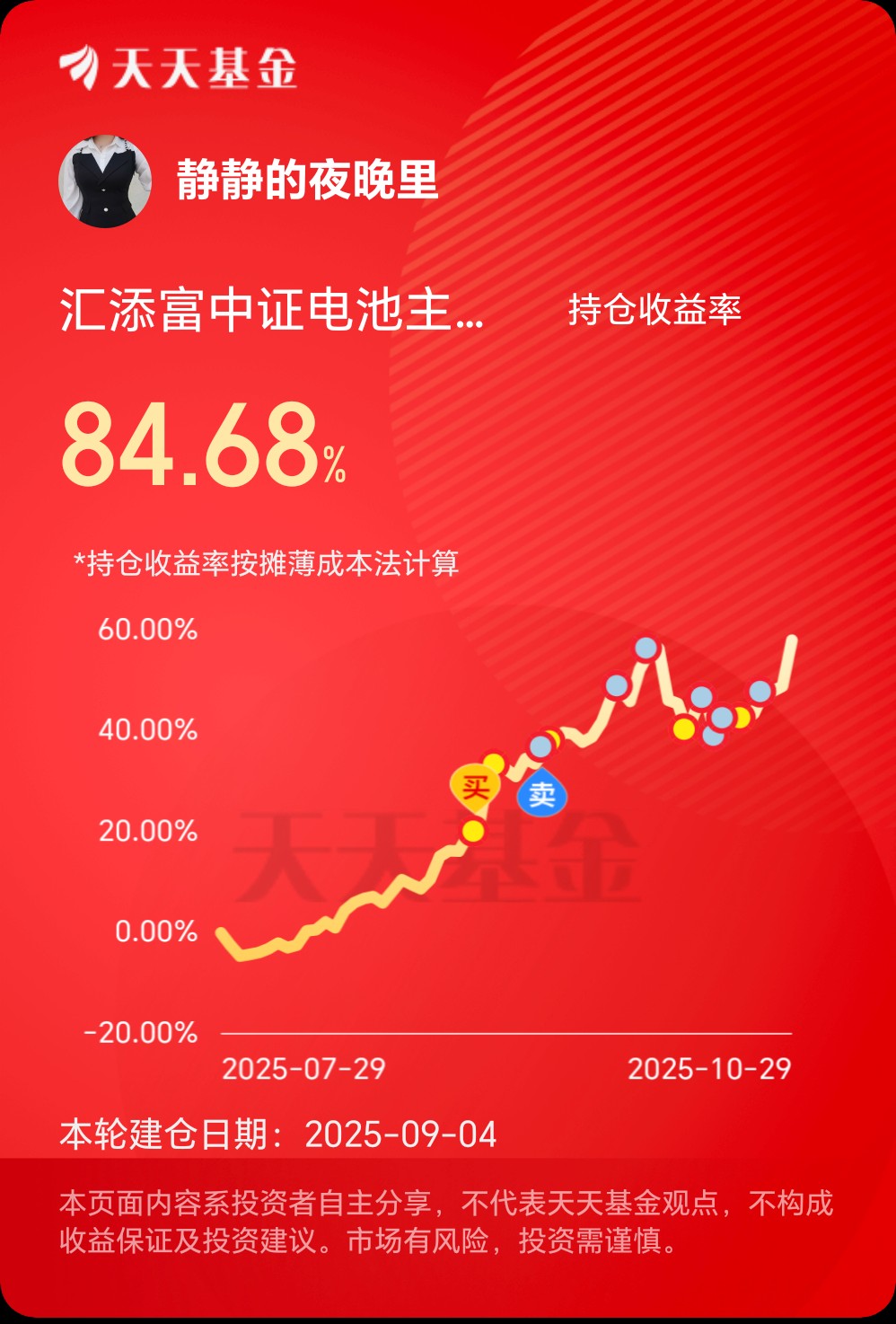 近期市场行情真的很香,今日沪深指数站稳4000点,进一步打开了上行的空间,但大科技赛道出现了明显的分化,资金明显切换到,上涨动力更强的新能源电池板块,从盘面来看,阳光电源再创历史新高,欣旺达、天赐材料等领域强势领涨!而当下固态电池概念和AI爆发带来的储能需求也在逐步增长,所以我觉得这波行情仅仅才刚刚开始,以我持仓的$汇添富中证电池主题ETF发起式联接C(OTCFUND|012863)$来说,目前实施估值继续稳定上涨,昨日净值更新大涨6.15%!