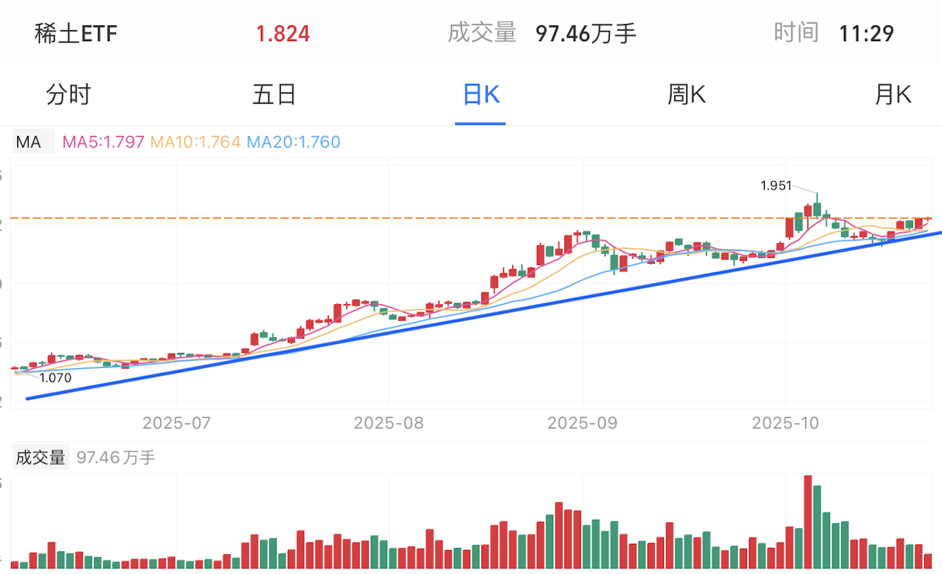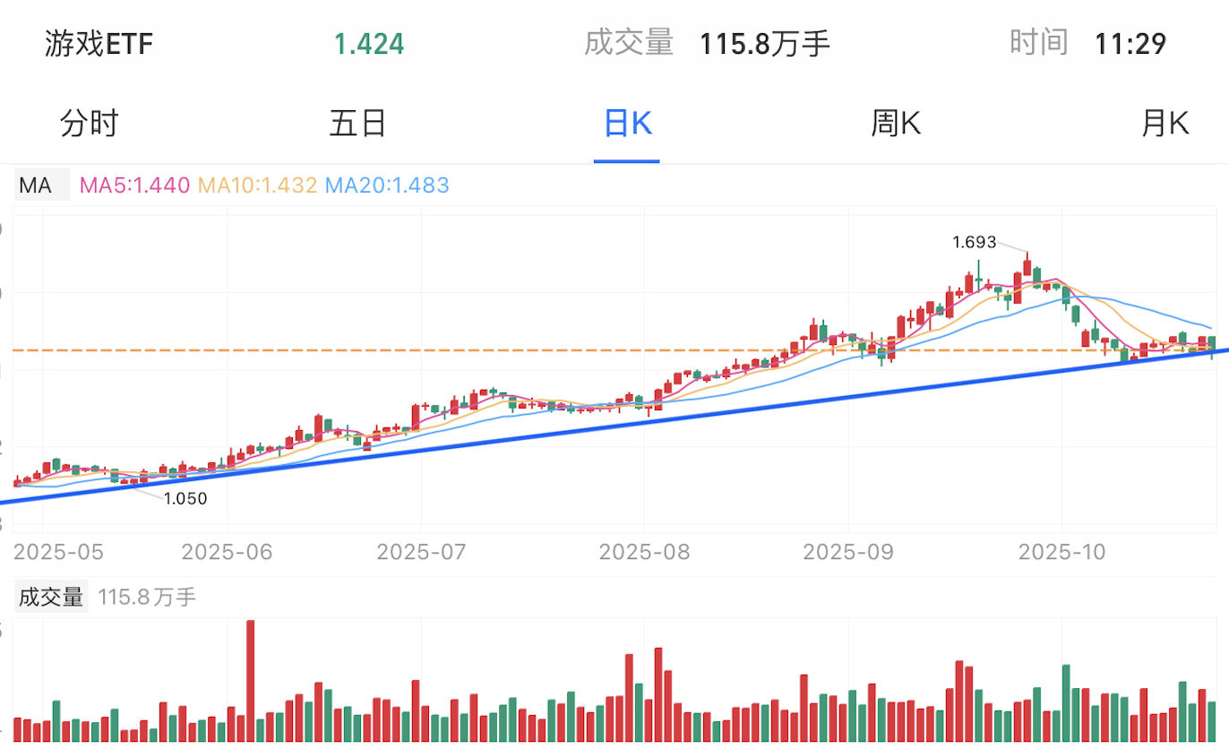 游戏和稀土近期有一波大行情,最近力竭回撤,跌至中长期上涨趋势线。稀土这两日守住关键支撑位,继续盘整行情。游戏较弱,逼近支撑,跌破则可能进入回调阶段。