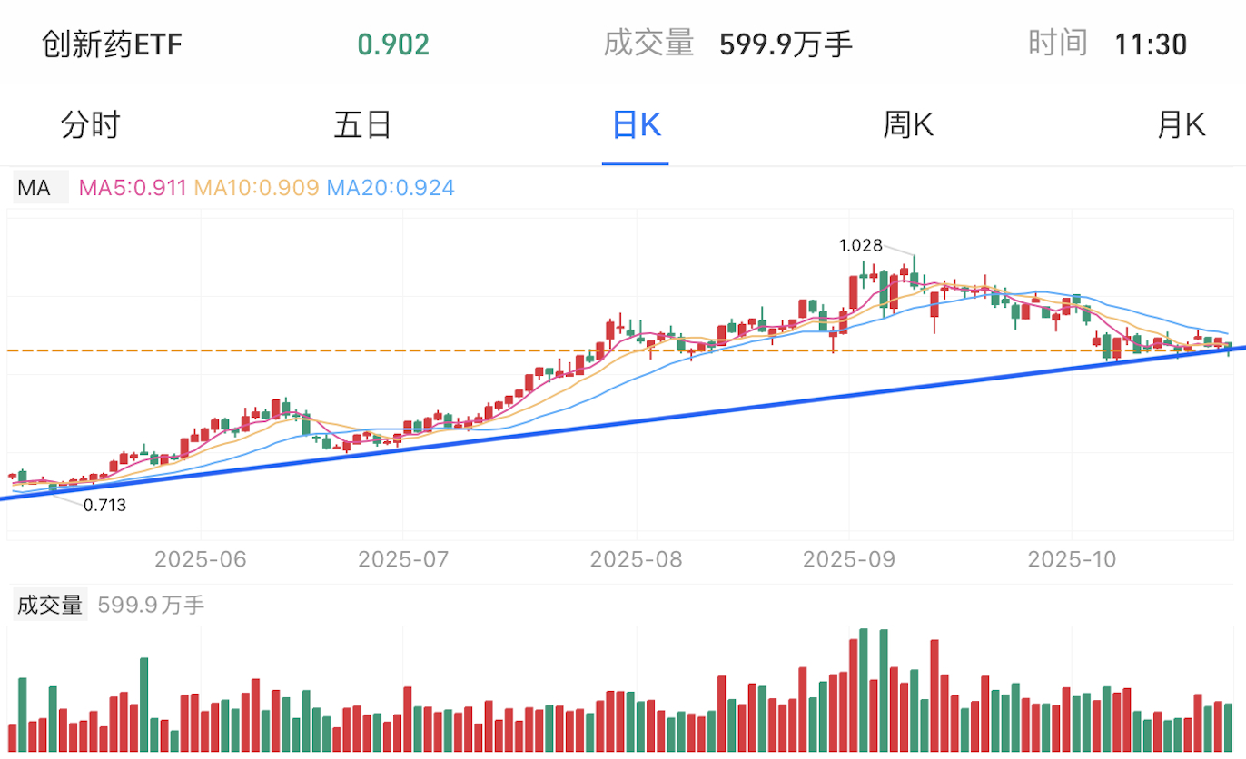 创新药近期大幅上涨,后力竭盘整,跌至中长期上涨趋势线,这几日窄幅震荡,似乎止跌横盘,但今日再次下跌,逼近支撑。而港股创新药已经跌破支撑,趋势已经下行。后市继续回调风险加大。