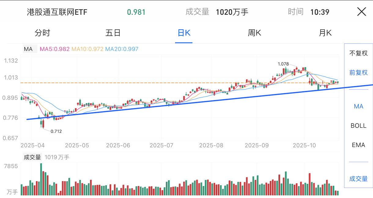 今日加仓1000。近期港股震荡,但整体趋势依然向上。受美联储降息与人民币企稳带动,海外资金持续回流,新经济板块重获市场关注。核心龙头基本面稳健,AI应用与内容生态不断释放成长潜力。经历前期估值回调后,港股互联网的性价比显著提升。该基金紧密跟踪港股通互联网指数,核心持仓覆盖优质龙头企业,既具估值修复空间,又有成长弹性。今日板块短线企稳反弹,或预示新一轮行情。本人持续布局。(非投资建议)