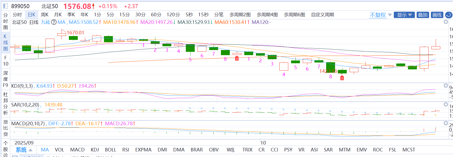 北证50:继续冲!再加1000元$大成北证50成份指数发起式C(OTCFUND|024162)$,相信大家都看到了昨天的重磅消息!北交所董事长昨晚发话,要加快推出北证50ETF,这直接点燃了市场热情!昨天北证50午后猛拉8个点,今天继续涨近3%,这波消息面驱动的行情必须跟,毕竟北证50已经蛰伏了很久,麦爸一直在等一个明确的反转信号,既然它来了,我自然是要把握的。