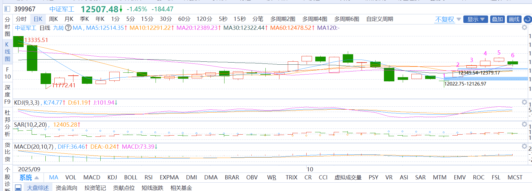 军工板块:行业处于"十四五"收官之年的冲刺阶段,产业链弹性可期。短期以持有为主,技术面震荡整理,