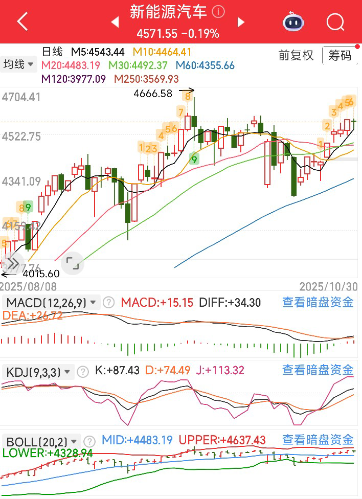 技术面上看,新能源车指数现在走得很稳,短期均线一直往上爬,中期趋势也站得比较牢。不过KDJ指标已经冲到100以上了,说明短期有点过热,布林带上轨也快碰到了,可能得先歇歇脚消化一下获利盘。MACD红柱子还在拉长,多头力量没完,但别追高。 我认为这波行情还没完,但可以等回调到均线附近再分批投,重点盯住电池、电机这些核心零部件环节,别光盯着整车厂