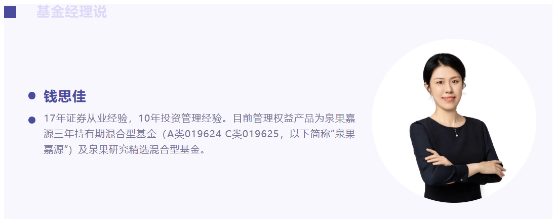 风险提示:本文不代表泉果基金的任何意见或建议,不构成泉果基金对未来的预测。所载信息仅供一般参考,前瞻性陈述具有不确定性风险。本文所涉个股不构成任何推荐。泉果嘉源三年持有期混合每份基金份额设3年锁定持有期,锁定期内不可赎回。泉果嘉源三年持有期混合为混合型基金,其预期风险与预期收益高于债券型基金与货币市场基金,低于股票型基金。基金过往业绩不预示未来表现,管理人管理的其他基金业绩不构成本基金业绩的保证。基金有风险,投资需谨慎。基金管理人不保证基金一定盈利,也不保证最低收益,投资者在投资前请认真阅读《基金合同》《招募说明书》等法律文件及相关公告。本基金管理人评级为中风险等级(R4),适合积极型(C4)及以上的投资者,具体风险等级评级结果以销售机构为准,请投资者根据风险承受能力购买风险等级相匹配的产品。本基金由泉果基金发行管理,代销机构不承担产品的投资和兑付责任。