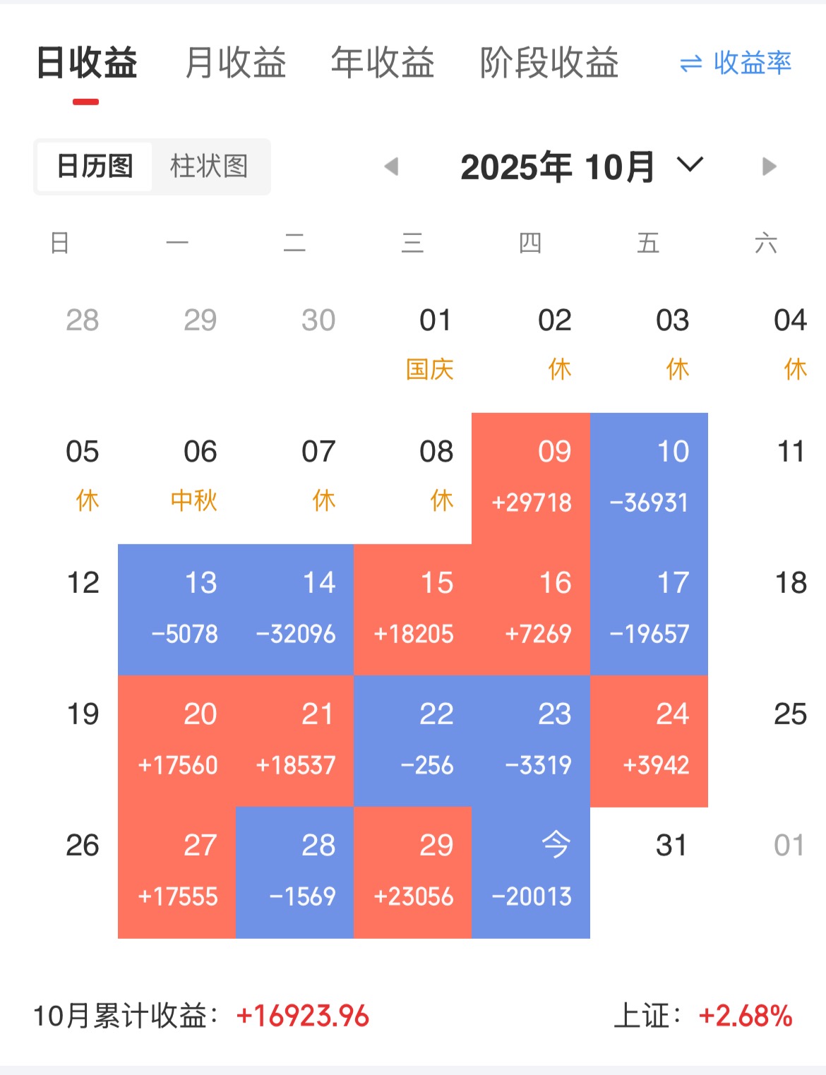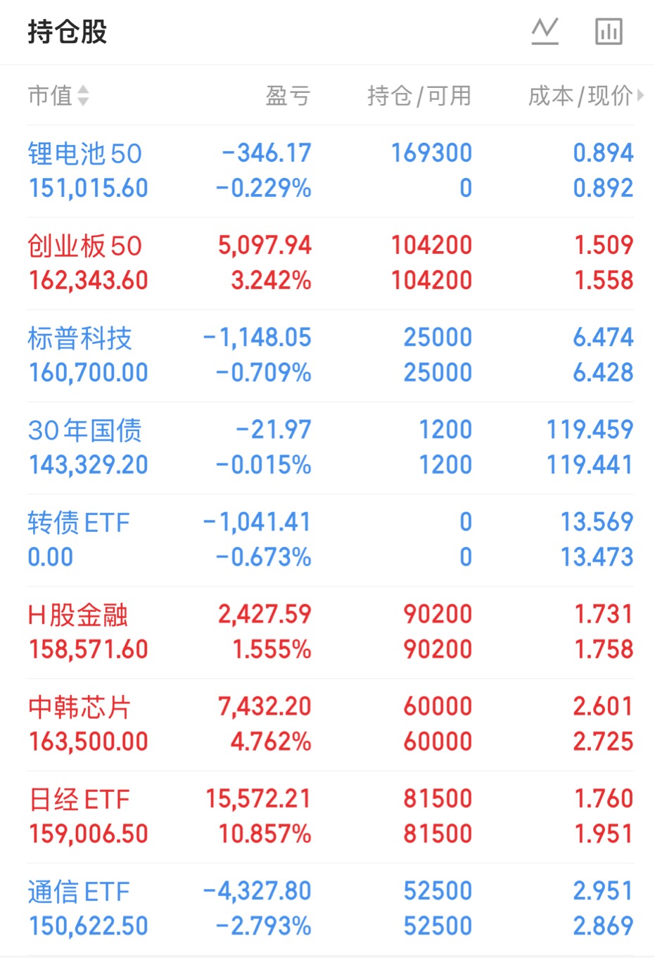 今日账户亏损:20013元。 10月30日,A股三大指数今日集体下跌,截至收盘,上证指数跌0.73%,深证成指跌1.16%,创业板指跌1.84%,北证50跌1.3%。沪深京三市全天成交额24643亿元,较上日放量1736亿元。全市场4100只个股下跌。 ETF收盘涨跌不一,稀有金属ETF(159608)领涨2.77%,稀有金属ETF基金(159671)涨2.53%,稀有金属ETF基金(561800)涨2.46%。创业板50ETF富国(159371)领跌9.67%,港股通创新药ETF南方(159297)跌4.31%,创业板成长ETF(159967)跌3.84%。