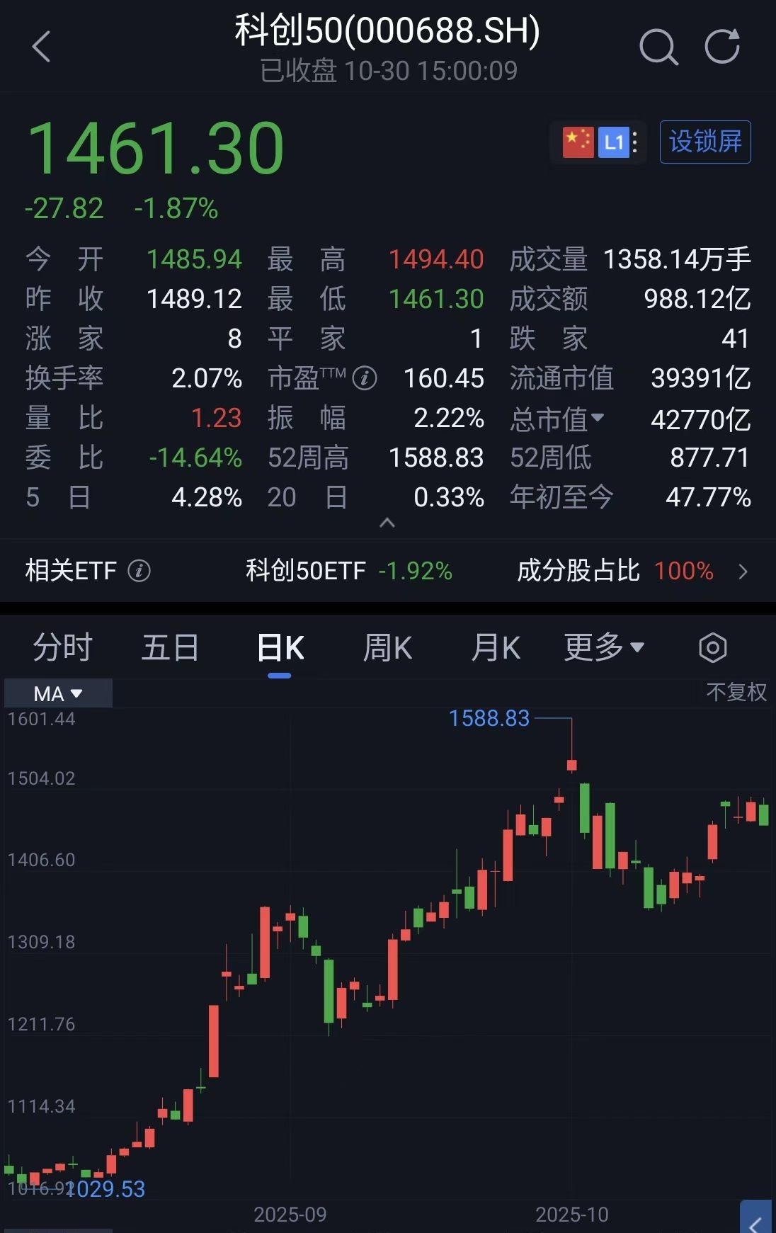 科创50跌1.87%,收于全天最低点