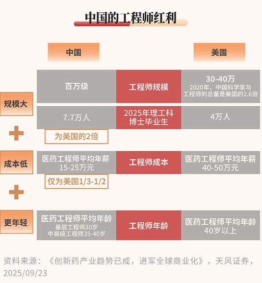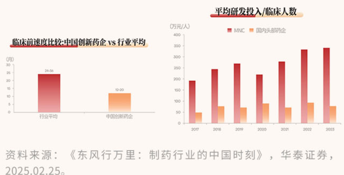 华泰证券指出,中国创新药企在临床前阶段可以将时间缩短至行业平均水平的1/2(麦肯锡数据);中国创新药企人均临床研究成本只有大型跨国制药公司的约30-50%(医药魔方数据)。