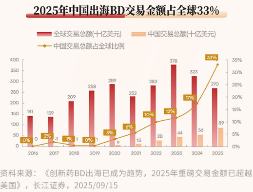 从BD看,2025年中国创新药BD交易正在从数量突破转向质量提升。据长江证券此前统计,截至9月15日,年内中国创新药BD交易总金额已远超去年全年,且全球占比已达33%。