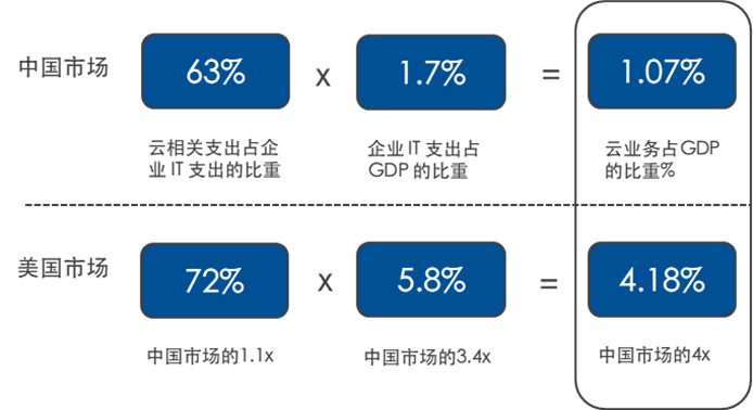 图:中国云市场的长期空间:对标美国,仍有四倍上行空间