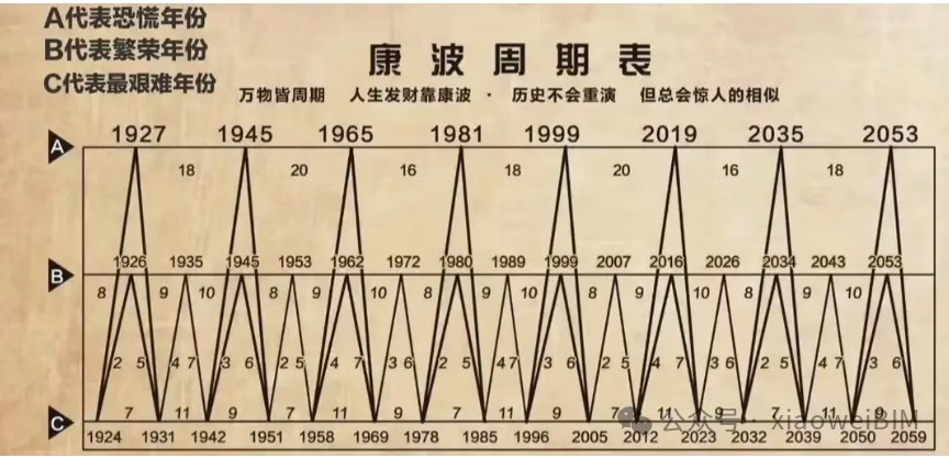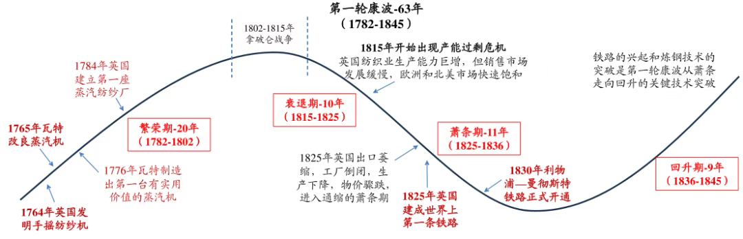 康波周期认为每一轮周期的兴起,根本动力都是技术革命。比如第一轮是由蒸汽机驱动的纺织时代,整个过程持续了63年。目前主流的观点认为我们正处在第五轮康波周期的萧条期末端,并可能即将迈向第六轮周期的回升阶段,也就是从萧条到复苏的过度阶段。