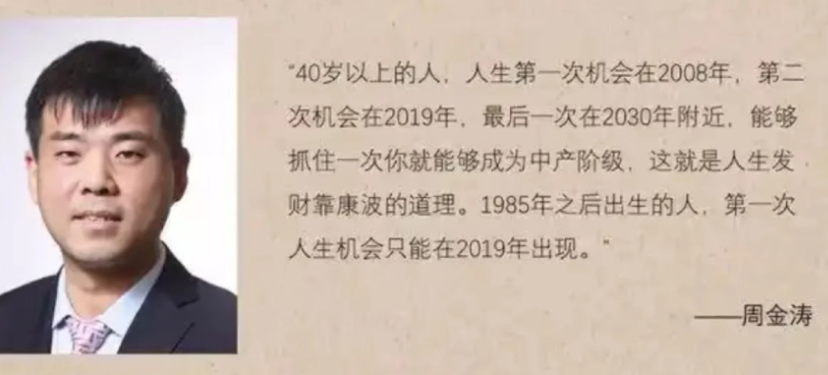 这个概念的普及,周金涛功不可没,他当年有句名言,相信很多人都听过,叫做:“人生财富靠康波。”他当时是中信建投的首席经济学家,因为成功预测了2007年的次贷危机、2015年的全球资产波动,所以被很多人奉为“周期天王”。