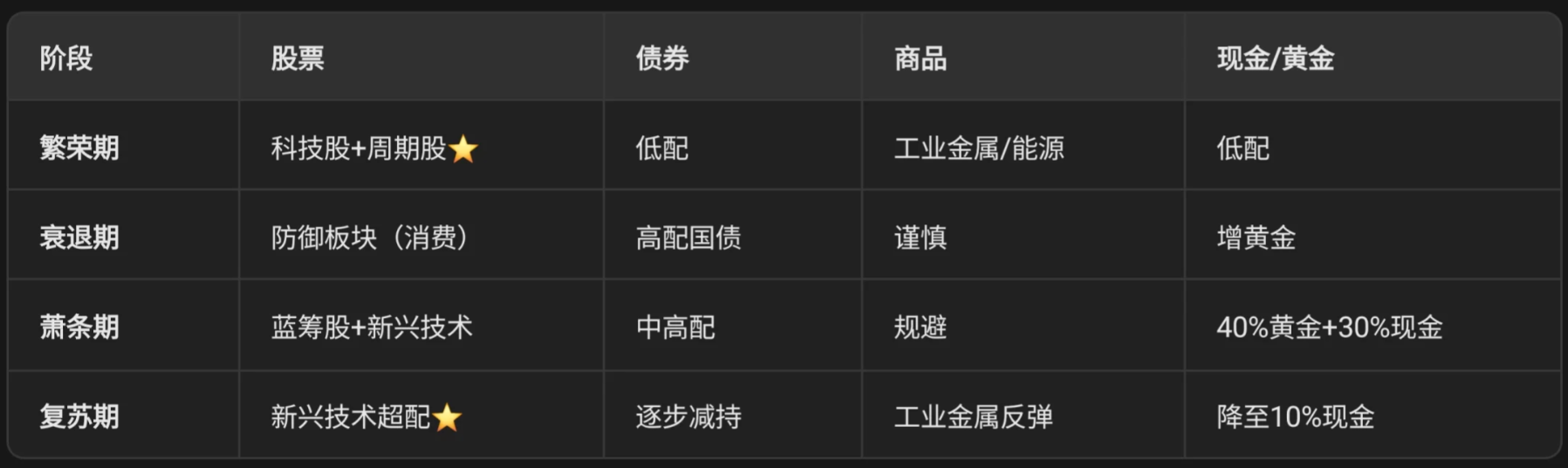 繁荣期可以多配科技股、周期股和大宗商品,少配债券和黄金;衰退期就要转向防御,增配债券和黄金;萧条期则现金为王,黄金也是不错的选择;等到复苏阶段,就可以择机增配高成长板块,逐步减少债券和黄金的仓位。