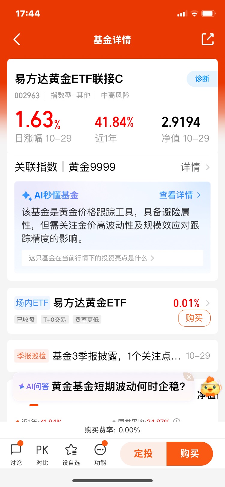 说到具体的投资工具,我最近特别关注易方达黄金ETF联接C(代码:002963)。作为一只指数型基金,它主要通过投资黄金ETF来跟踪国内黄金价格走势,具有运作透明、费率较低的特点。经过深入研究,我认为这只基金的投资机会主要体现在以下几个方面: