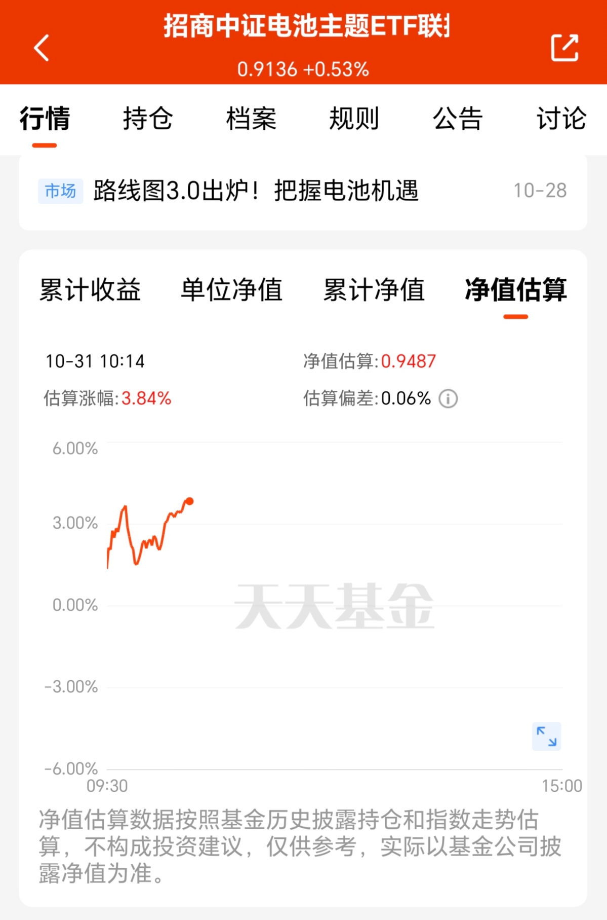 今日A股市场呈现涨跌互现,个股也是分化明显,但电池赛道再次强势上涨,迎来了一波七连涨行情,以我看好$招商中证电池主题ETF联接C(OTCFUND|016020)$来说,目前实时估值大涨3.84%,近三个月涨幅高达61.73%,持仓聚焦于电池全产业链,所以可以充分享受这波上涨趋势,而当下储能需求也在持续高涨,对固态电池也是长期的利好,我也将长期看好这一赛道啦!