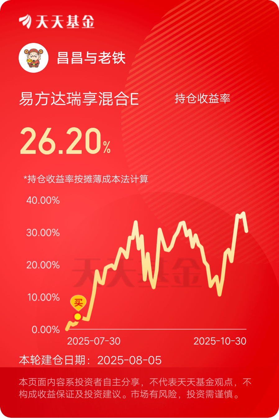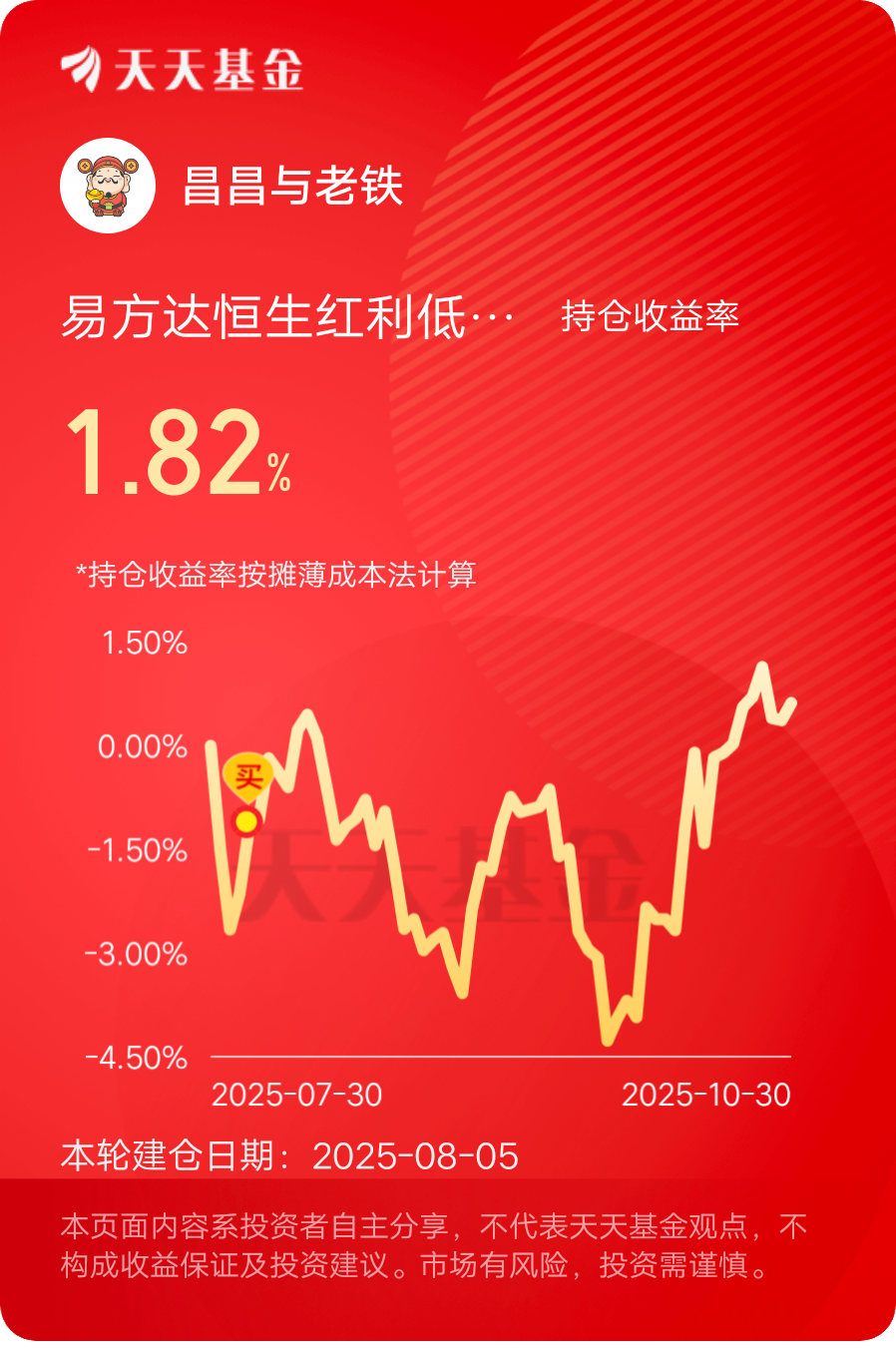 后续将持续跟踪三季报披露进度,若成长板块业绩超预期信号明确,会考虑加大易方达瑞享混合E的配置比例,把握修复行情;若短期市场仍以震荡为主,恒生红利低波的防御属性也能保障组合整体收益稳定性。投资的核心是在不确定性中寻找确定性,这个组合既贴合当前对业绩驱动的判断,也为市场超预期波动预留了应对空间,符合自身风险承受能力与收益目标。@易方达基金 $易方达瑞享混合E$ #晒收益#