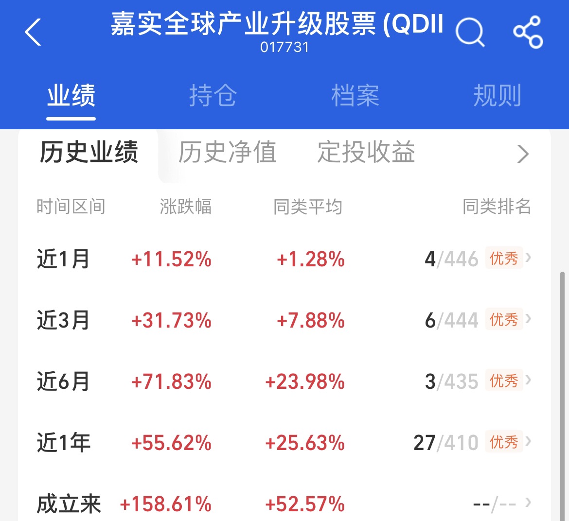全球市场在震荡行情的投资机会还是挺多的,多区域的市场配置可以有效分散行业风险。关注的$嘉实全球产业升级股票发起式(QDII)C$ 投资全球市场,同时覆盖美股、港股与 A 股三大市场。包括英伟达、博通、台积电、华虹半导体等等。在美联储降息周期下,能同时把握美股科技红利、港股估值补涨空间和A 股新质生产力转型,产业结构优势显著。连续上涨5天,近一周涨幅7.71%,近三月上涨31.73%,近半年上涨71.83%,盈利能力较强。综合分析,未来成长空间较大