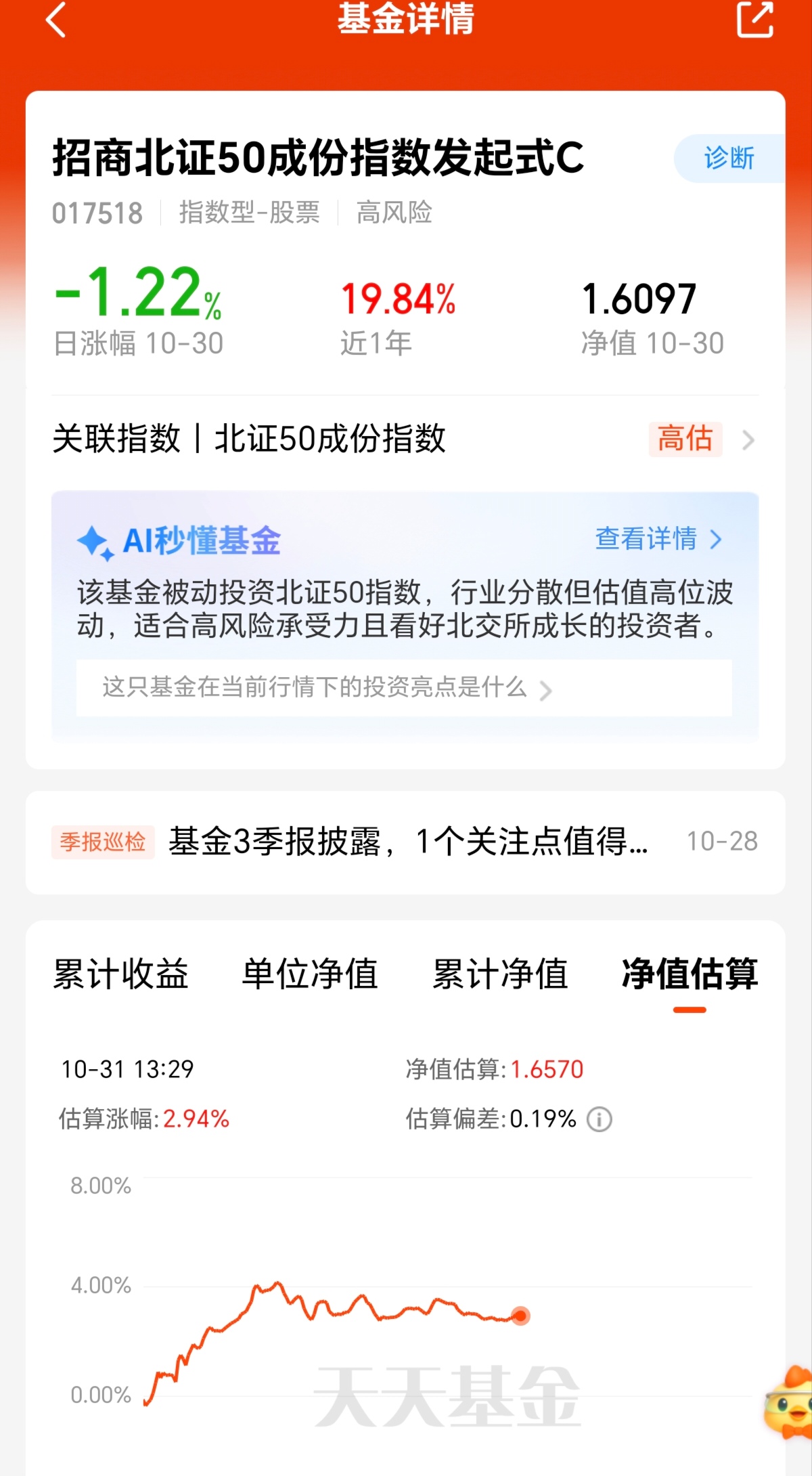 近期大盘在突破4000点之后,整体呈现震荡趋势,市场风格也在开始切换,从盘面来看经历过几番调整过后的北证50,涨幅力度喜人,加上“十五五”仍然把新质生产力当做市场主线,所以我觉得后期还有很大上涨动力,今天顺势加仓一波$招商北证50成份指数发起式C(OTCFUND|017518)$相信后期会有不错收获!