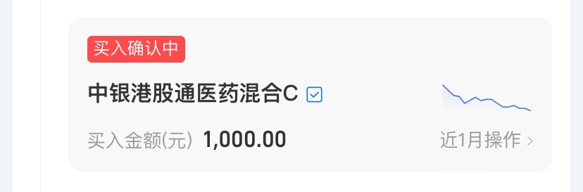 $中银港股通医药混合发起C$ 大侠今日继续加仓1000元,今年假期以来降息降准以及整体货币宽松利好股市,今年以来近新药表现亮眼,刚好近一月有所回调,所以我选择继续入手一些中银港股通医药,中银布局港股创新药为主,还持仓了一些传统医药以及其他资产来稳定持仓,整体来看今年走势稳步向上,拉长时间来看近一年涨幅70.65%,同类排名非常不错,从信息面来看,国内政策持续利好下,医药板块仍然有向上空间,短线来看涨幅过大技术性也会有回调,不过创新药板块基本面相对稳定,加上国内近期医疗板块政策利好不断,创新药审批加速,医疗设备更新政策落地,行业景气度持续提升,长期来看我觉得目前是比较好的入手时机,今天大侠继续加仓一些中银港股通医药混合来增厚收益,期待后续收益多多。