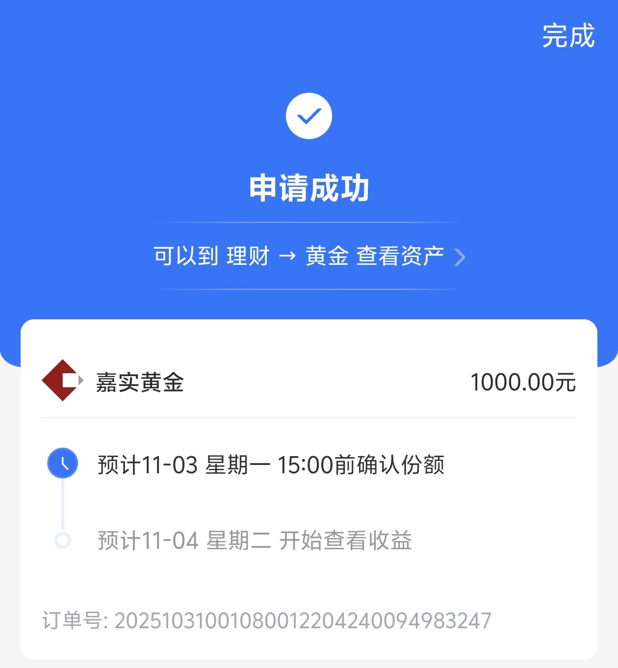 $嘉实上海金ETF发起联接C$ +1000元,基金近期表现的也是非常的不错。环境一个月上涨了3.73%,近一年的收益率高达38.14%,盈利能力强。随着美联储9月开启降息周期,各国央行连续19个季度购入黄金,为金价提供了重要支撑。目前地缘与经济的不确定性,推动黄金配置与对冲风险。而且多家投行对黄金后续走势乐观预期。今天我也是布局了,期待后期收益。