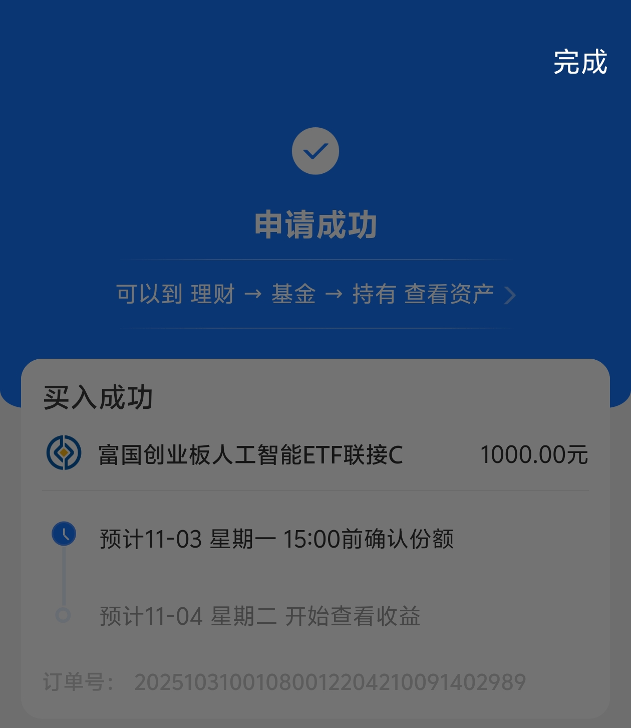 今天开盘后我又补了1000块,继续加$富国创业板人工智能ETF发起式联接C$里。