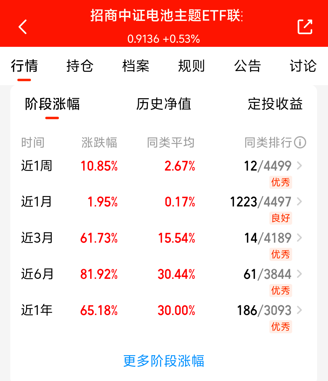 电池板块表现不错,今天继续上涨!大盘突破4000点后有开始震荡调整了,近期市场波动比较大,固态电池表现还不错,$招商中证电池主题ETF联接C(OTCFUND|016020)$近一周涨了10.85%,近三个月涨了61.73%,业绩不错呢,长期看好电池板块,我准备分批上车了!