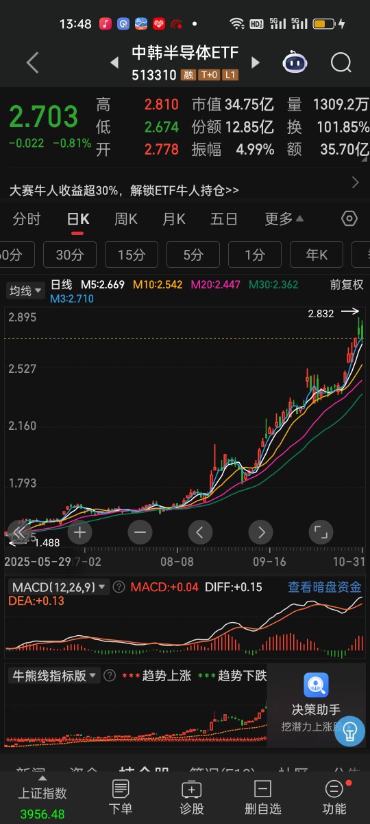 受到中国半导体下跌拖累,今天下跌。技术面暂时没有跌破5日均线,继续持有