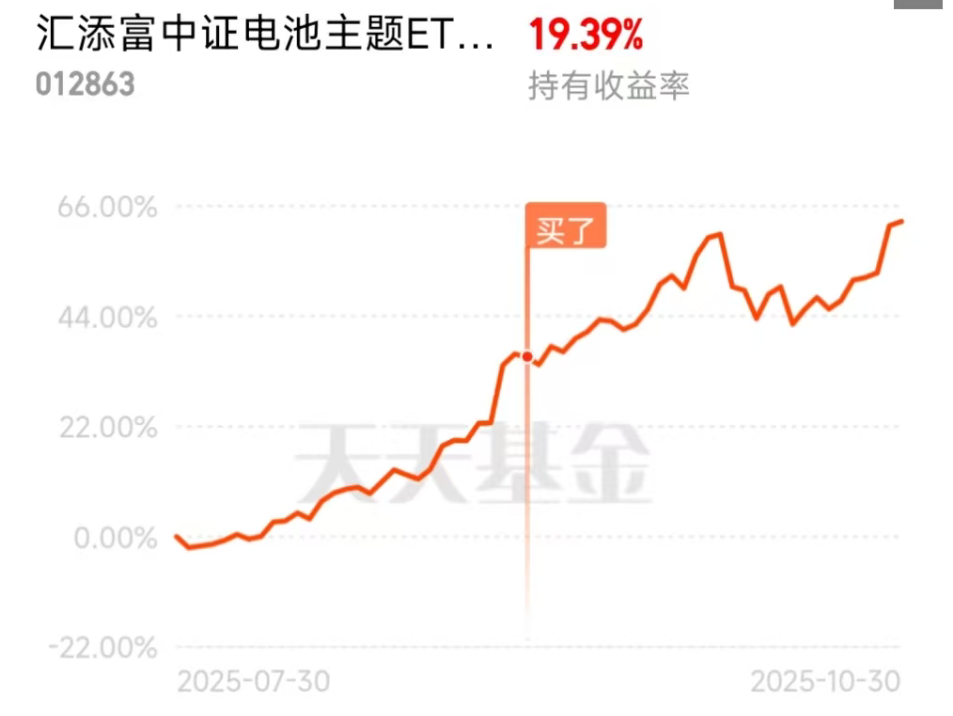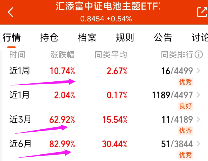 今天A股三大指数集体调整,创业板跌超1.6%,跌幅居前,两市个股涨多跌少,超3800股上涨,成交额略有放量,创新药触底反弹,今天表现活跃,科技板块整体低迷,持续调整,固态电池板块延续强势,又逆势上涨了,$汇添富中证电池主题ETF发起式联接C(OTCFUND|012863)$估值+0.91%,涨势不错,已经连涨7天,果然强者恒强!近一周+10.74%,近三个月+62.92%,近六个月+82.99%,爆发力强,中长期业绩更优秀,赚钱能力杠杠滴,这业绩也堪比之前的上涨王者CPO了,继续跟紧。