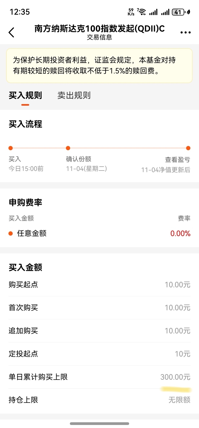 至于目前持有某方纳斯达克100指数qdlll基金,因在目前已经更改成每天限额只能选择300元这一点点资金的缘故。所以至于这个纳斯达克100指数qdll基金,在今天就暂时停止每天加班操作了。