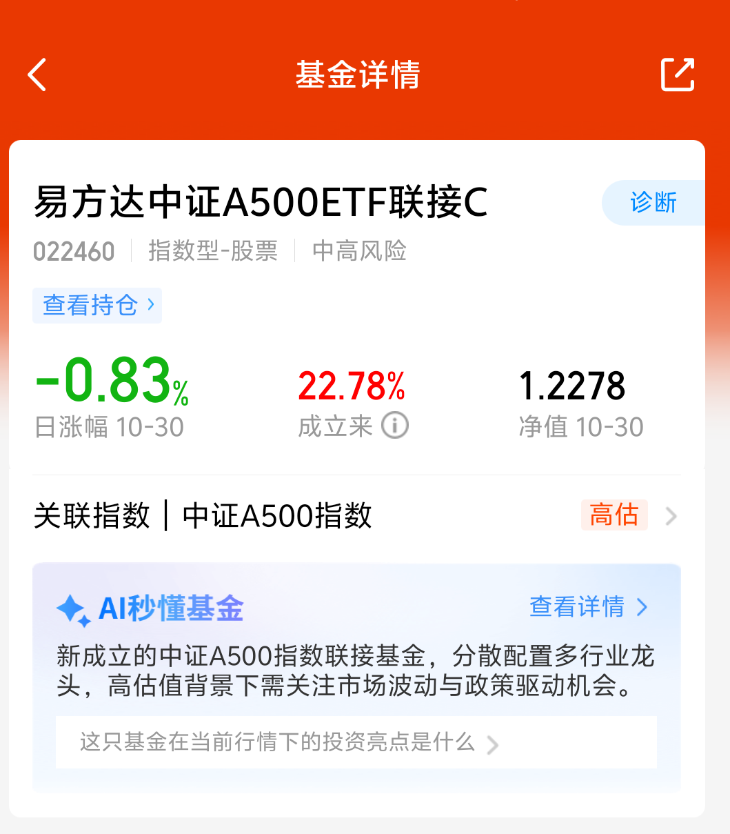 大盘今天震荡调整,沪指新高之后行业热点轮动速度很快,风格风格转化可能在临界点,单一赛道风险比较大,容易踏空,我准备分批加仓$易方达中证A500ETF联接C(OTCFUND|022460)$,作为底仓配置很不错,看好这个方向!