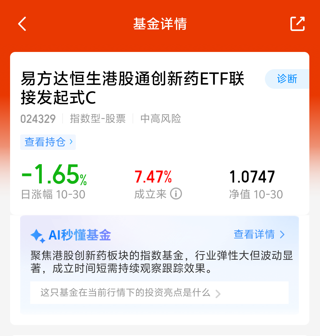 大盘今天震荡调整,创新药板块今天逆市大涨,产业基本面确实没有发生变化,8月以来的回调属于快速上涨后的正常调整,圣诞假期前可能会进入BD交易高频期,关注交易活跃度。$易方达恒生港股通创新药ETF联接发起式C(OTCFUND|024329)$目前预估涨幅3.52%,看好这个方向,我准备继续分批加仓了!