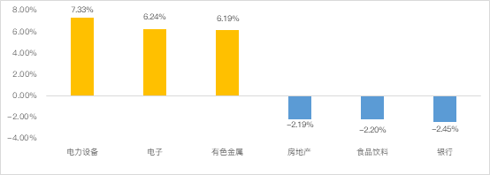 行业表现上,近一周电力设备、电子、有色板块涨幅居前,银行、食品饮料、房地产板块跌幅居前。