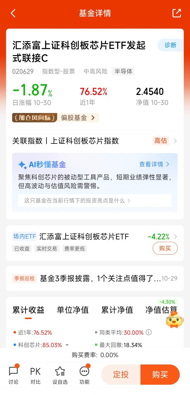 在众多投资科创芯片的工具中,汇添富上证科创板芯片ETF发起式联接C(代码:020629)展现出独特优势。该基金成立于2024年初,截至2025年10月30日,近一年收益达76.52%,成立以来收益达145.40%,稳居同类产品前列。这一卓越业绩的背后,是基金多维度优势的共同作用。