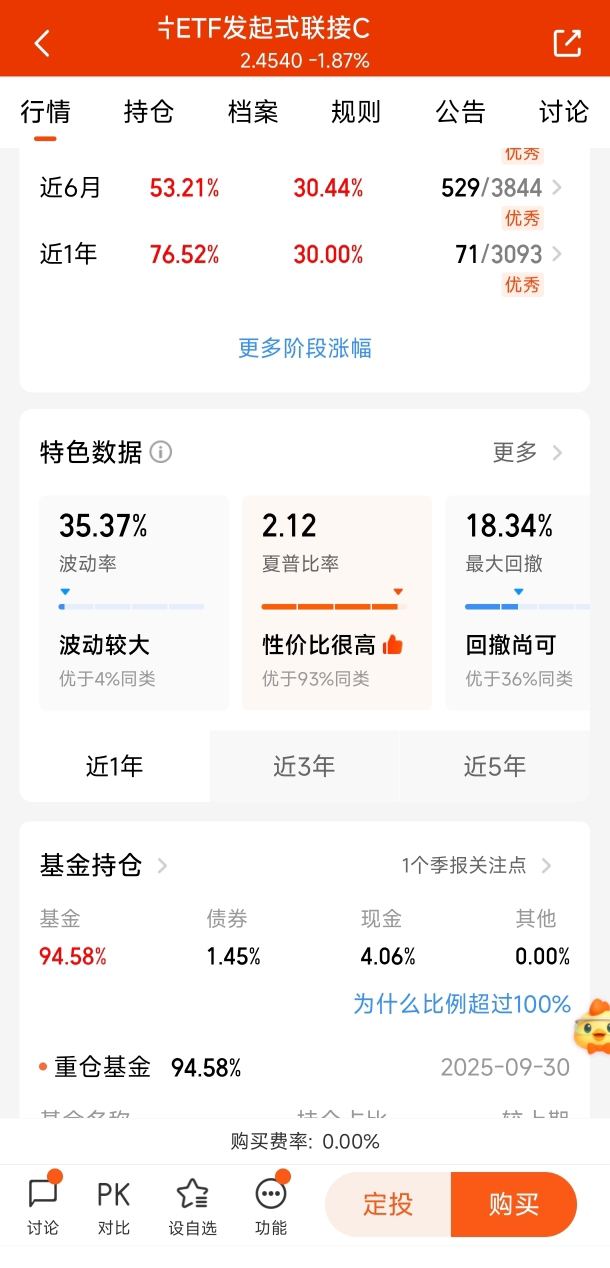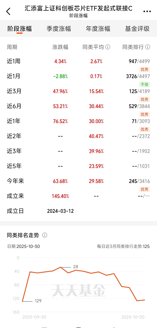 我的“躺平”策略,恰恰是对长期投资理念的最佳实践。汇添富上证科创板芯片ETF发起式联接C(020629)成为我国庆假期前布局的重点。基金截至10月30日近一年收益达76.52%,成立以来收益达145.4%,近一年夏普比率高达2.12,远超同类产品。这样的业绩表现,让我能够安心地在假期中“躺平”,而不必为短期波动所困扰。