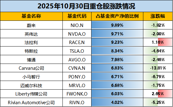 【十大持仓】根据最新披露的基金定期报告,截至2025年三季度末,华宝海外新能源汽车前十大重仓股包括蔚来、英伟达、法拉利、博通、特斯拉、Carvana公司、小马智行、迈威尔科技、Liberty传媒公司、Rivian Automotive公司,占基金资产净值比例合计为75.42%。
