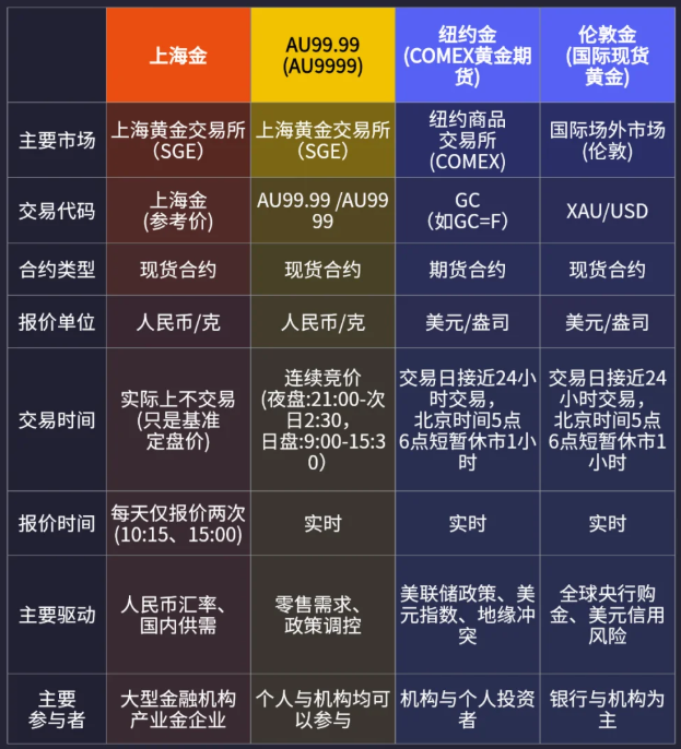其次,就算都是跟踪金价的基金,它们盯着的“目标”也可能不一样。国际金价主要有两类,伦敦金和纽约金,国内金价也分为上海金和Au9999。