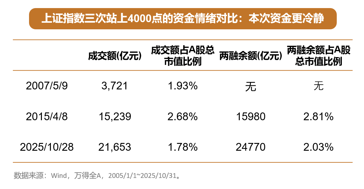 但2025年这次显得冷静了许多:虽然两融余额和成交额的绝对数值比2015年高,但是A股的总市值也更高,两融余额和成交额占A股的比例均在合理范围内。