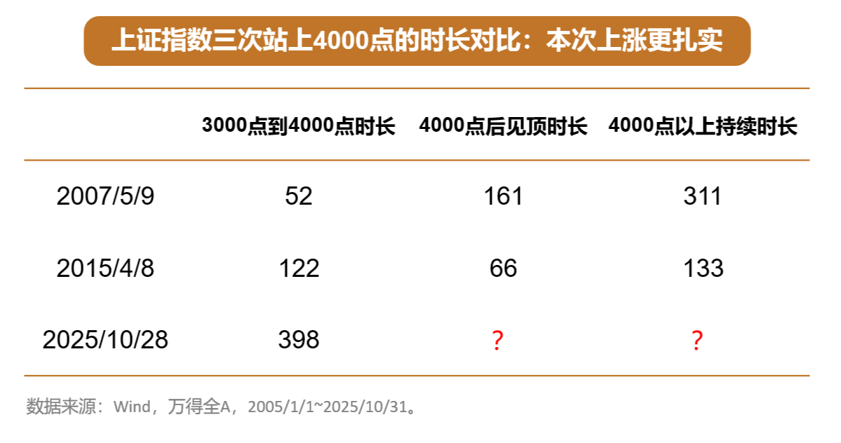 从3000点涨到4000点,这一轮用了一年多的时间(398天),比前两次久很多:2007年只用了52天,2015年用了122天。