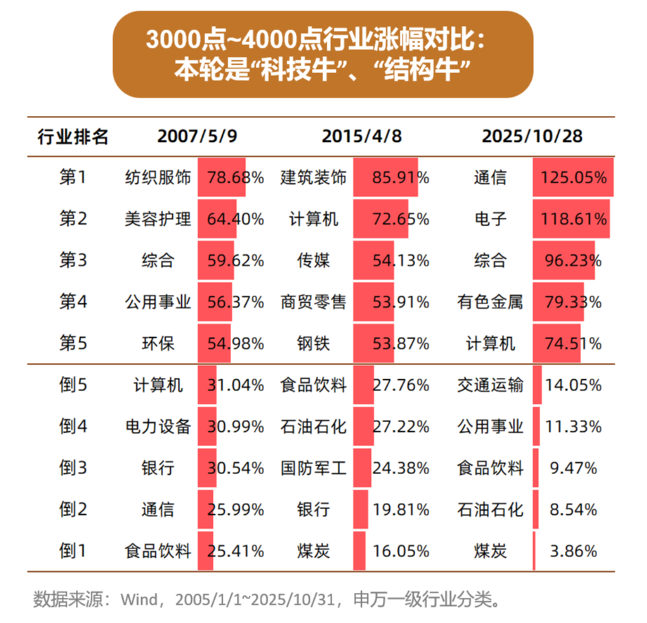 看3000点到4000点的领涨行业,也能直观感受到新旧动能的变化: