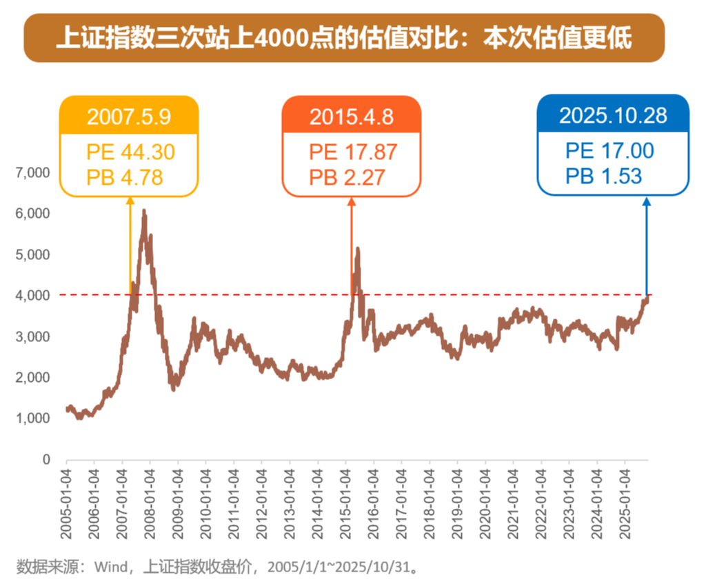 判断市场贵不贵,核心看估值,也就是市盈率PE和市净率PB。截至2025年10月28日,上证指数的PE估值是17,PB估值1.53。低于2015年估值水平,且显著低于2007年估值水平。简单说,现在的4000点,比前两次同点位“便宜”不少,泡沫感更弱。